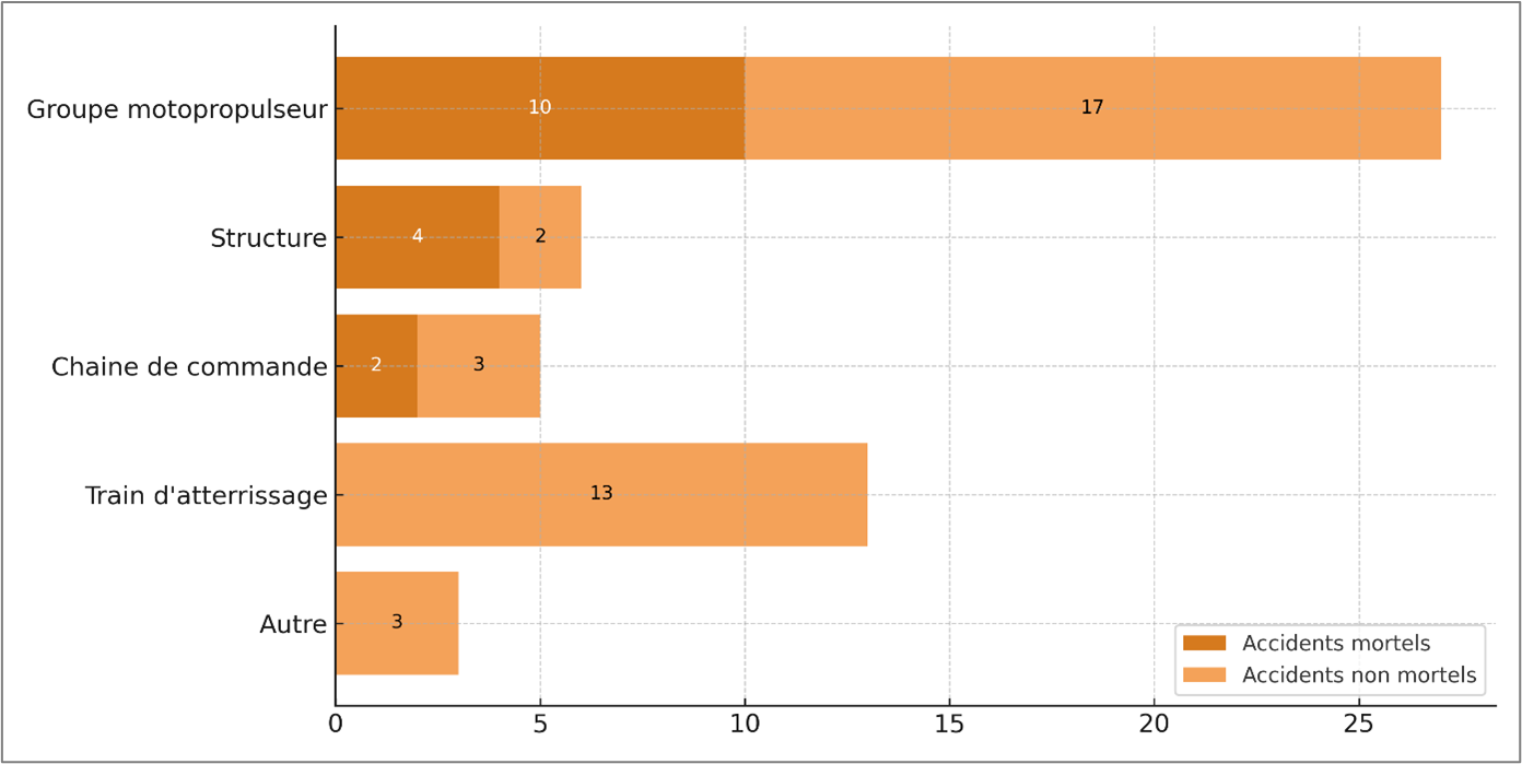 Entre 2021 et 2025, sur la base des informations collectées par le BEA, 218 accidents survenus en France et impliquant des aéronefs de moins de 5,7 t sont associés à un dysfonctionnement technique.