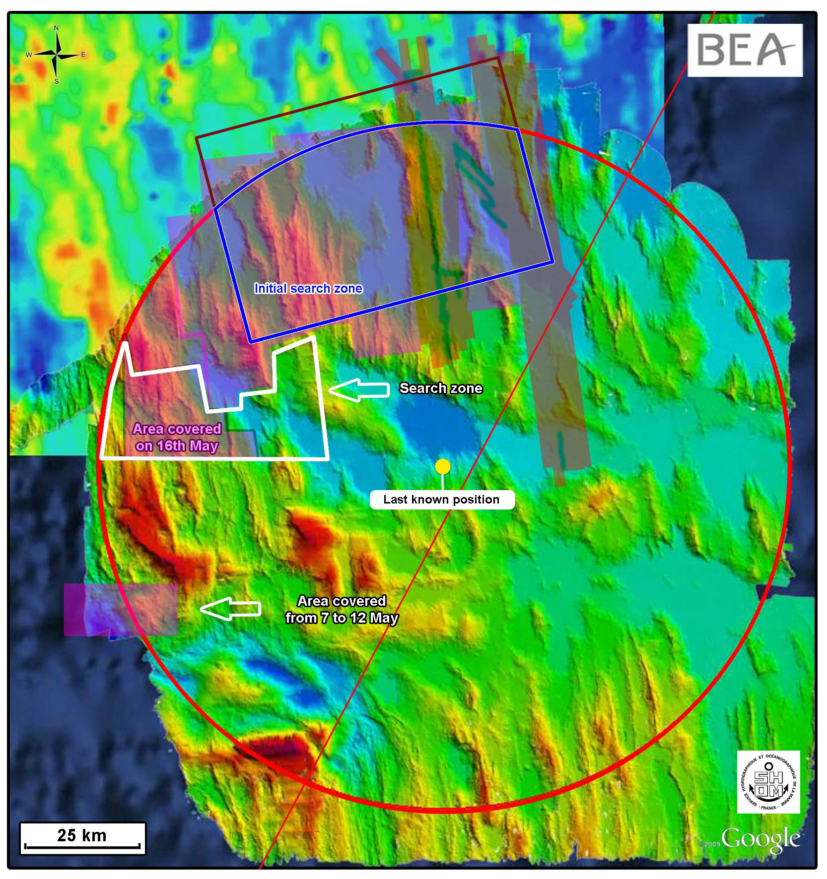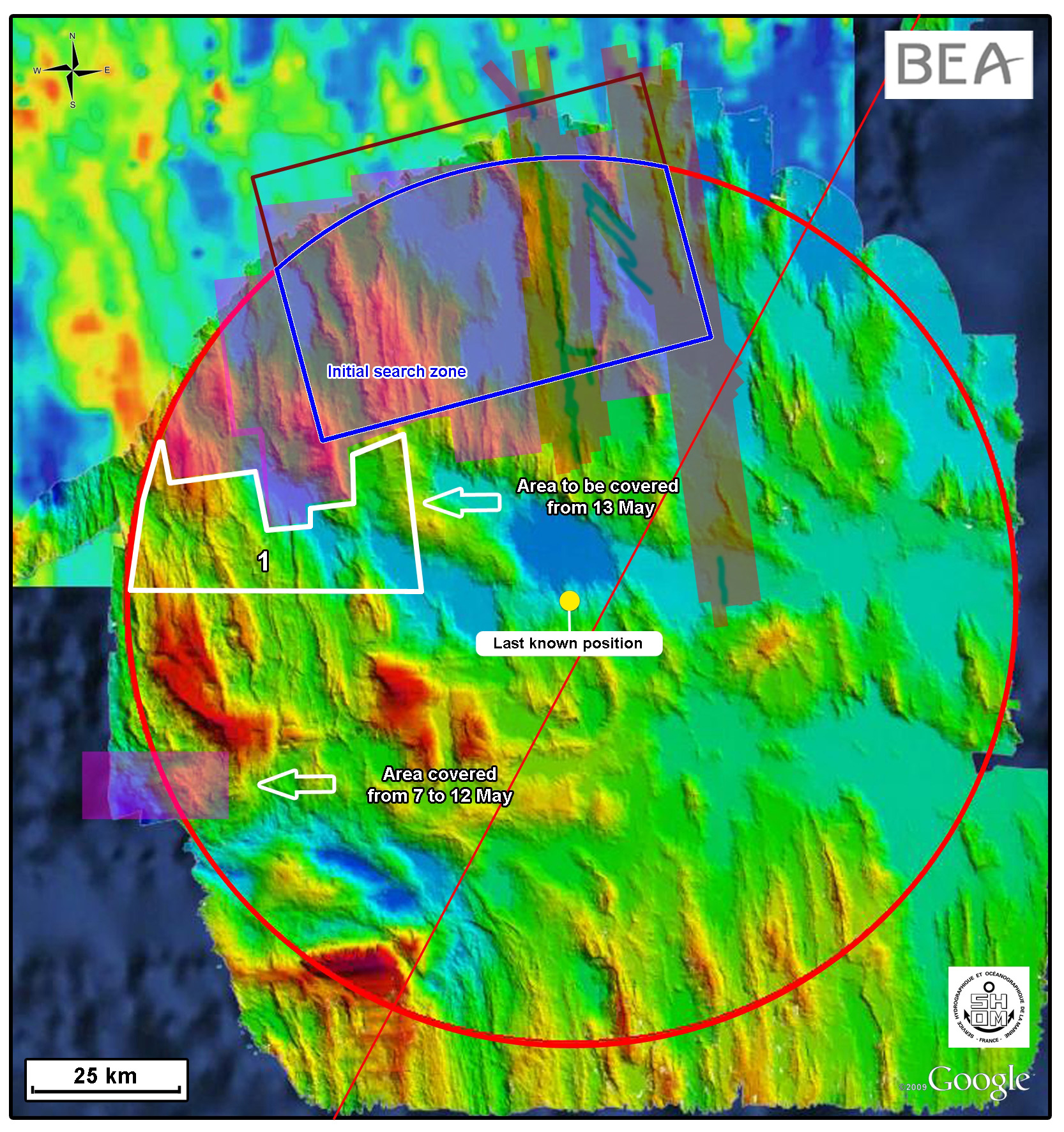 - 10 June – 10 July 2009: undersea searches to detect signals transmitted by the two flight recorders' emergency locator beacons.