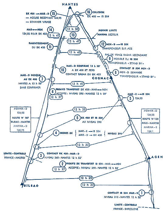 Ce virage, entrepris sans visibilité, au pilote automatique, à une faible distance de Nantes, (15 milles nautiques environ), amenait le BX 400 à couper à contresens la route convergente (W 132).