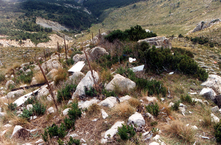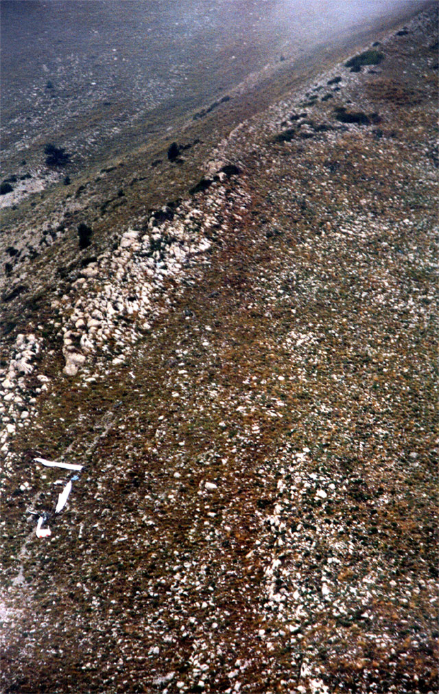 The Ventus crashed into a steep slope at 1500 m altitude and the pilot did not evacuate the aircraft. The wreckage was spread over 150 m of which about 70 m after the first impact with the ground. The glider was white and had two one-metre long red adhesive strips placed towards the tips of the wings.