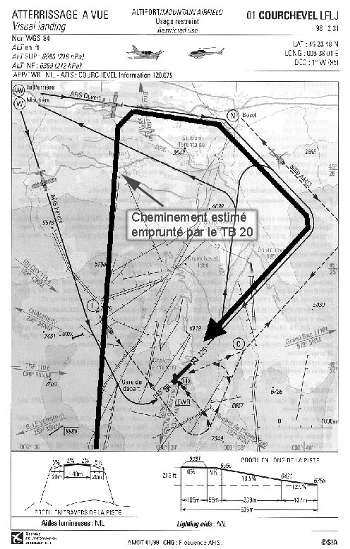 Le pilote du F-GNHK, en voyage de Montpellier à Annecy, décide de faire une escale à Courchevel. A cette époque de l'année l'AFIS est fermé. Le pilote explique qu'il arrive par le sud-ouest des installations (voir carte jointe). Il passe à l'ouest de l'altiport à une hauteur d'environ 500 pieds puis s'éloigne vers le nord . Il survole le point "N" et débute l'étape de base. Au cours de ces évolutions il émet des messages d'auto-information, mais semble-t-il sur une fréquence autre que celle allouée à l'altiport (la fréquence de Courchevel aurait été préparée mais non activée). Pendant ce temps le pilote du HB-CJX met en route près du hangar. Il indique qu'il informe sur la fréquence de Courchevel qu'il roule jusqu'au point d'arrêt. Il y prépare sa machine et vérifie visuellement qu'aucun aéronef n'évolue dans le secteur. Il ajoute que ne voyant pas d'aéronef en finale et n'en ayant pas entendu arriver, il informe à la radio qu'il s'aligne et débute le décollage. En passant dans la pente il découvre devant lui le TB 20 qui vient d'atterrir. De façon réflexe il tire sur le manche pour tenter de décoller. L'avion se soulève mais retombe sur la partie arrière du F-GNHK.