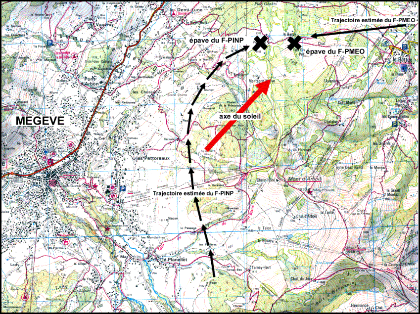 Le Jodel D 119 immatriculé F-PINP décolle vers 14 h 05 de l'altiport de Megève situé à une altitude de 4800 pieds pour un vol d'instruction en direction du massif du Mont Blanc. Il longe ensuite, en montée, les flancs ouest puis nord du Mont d'Arbois. Le Jodel D-119 immatriculé F-PMEO décolle de l'aérodrome privé de "La Gravière" situé sur la commune des Houches à une altitude de 3300 pieds en direction de l'altiport de Megève pour y effectuer un ravitaillement. Le F-PMEO longe également le flanc nord du Mont d'Arbois avec un cap estimé de 260°, en montée, pour se reporter sur le point "Novembre" à une altitude de 5600 pieds, point de report obligatoire pour intégrer le circuit de l'altiport de Megève.