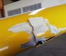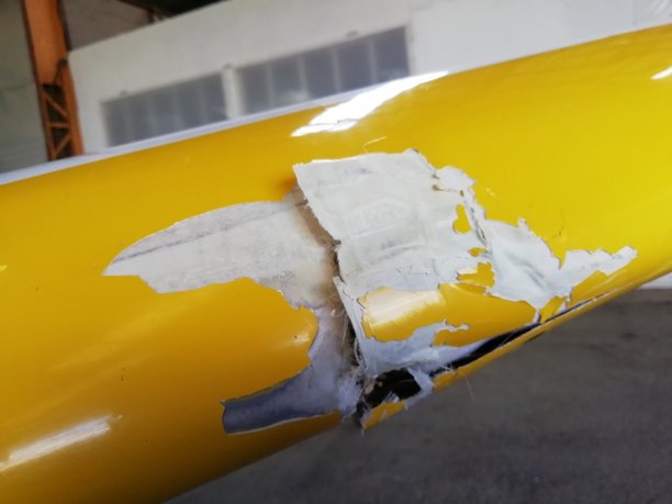 À l’issue d’un vol en double commandes en circuit de piste avec son instructeur, l’élève-pilote le dépose au pied de la tour de contrôle et reprend le roulage vers le point d’arrêt 23 en vue d’effectuer un vol solo. Une fois autorisé par le contrôleur, l’élève-pilote s’aligne depuis l’extrémité de piste[1] puis décolle en mettant progressivement la puissance. Après une centaine de mètres, l’avion embarque progressivement sur la gauche. L’élève-pilote ne parvient pas à contrôler cette embardée et décide d’interrompre le décollage en réduisant la puissance puis en freinant. Alors que l’avion est proche de l’arrêt complet, , le pilote ressent un choc en atteignant la bordure de piste au niveau de la bretelle A4 (voir figure 2, trajectoire de l’aéronef estimée à partir de l’enregistrement vidéo, fond de carte : source SIA). Il l’interprète comme le passage du train principal gauche dans un trou à la surface de la piste en herbe. Par précaution, il décide d’interrompre le vol et rejoint le parking de l’aéro-club. Le roulage ne pose aucun problème. La réponse du train avant aux sollicitations sur les palonniers est satisfaisante. Une fois arrêté au parking, l’élève-pilote constate que l’aile gauche est endommagée au niveau de la nervure 8 (voir figure 1, bord d’attaque gauche du F-GSBN, photo Atelier Aéro-Club Renault). Cette déformation a été provoquée par un choc avec un panneau de signalisation frangible situé en bordure de la bretelle A4.