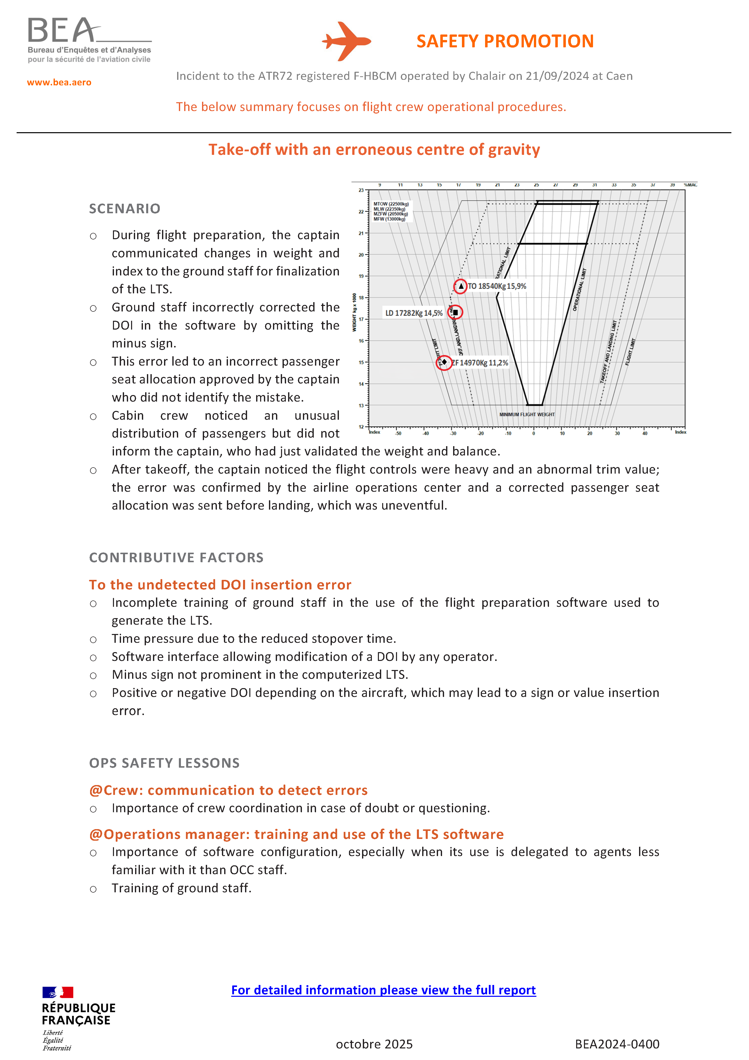 Incident survenu à l'ATR72 immatriculé F-HBCM exploité par Chalair le 21/09/2024 à Caen